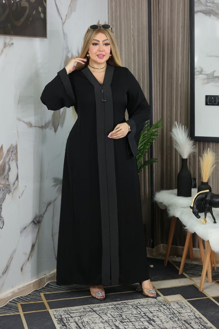 عباية نسائية باللون الأسود بتصميم أنيق وانسيابي، تتميز بقصّة واسعة تمنح مظهراً راقياً ومريحاً. الأكمام واسعة ومزينة بتطريزات ناعمة تضيف لمسة فخامة هادئة. العباية مصنوعة من قماش خفيف بانسدال جميل، مناسبة للاستخدام اليومي والمناسبات. تظهر العارضة بإطلالة عصرية مع حجاب أسود ونظارة شمسية، مما يعكس أناقة العباية وبساطتها في آنٍ واحد.