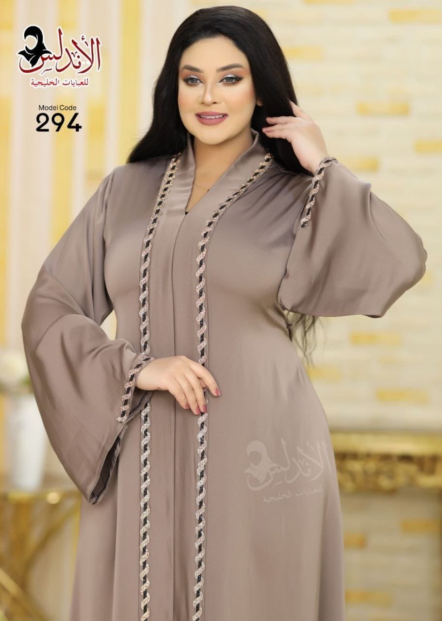 عباية نسائية بتصميم أنيق وانسيابي، تتميز بقصّة واسعة تمنح مظهراً راقياً ومريحاً. الأكمام واسعة ومزينة بتطريزات ناعمة تضيف لمسة فخامة هادئة. العباية مصنوعة من قماش حرير بانسدال جميل، مناسبة للاستخدام اليومي والمناسبات. تظهر العارضة بإطلالة عصرية مع حجاب أسود ونظارة شمسية، مما يعكس أناقة العباية وبساطتها في آنٍ واحد.